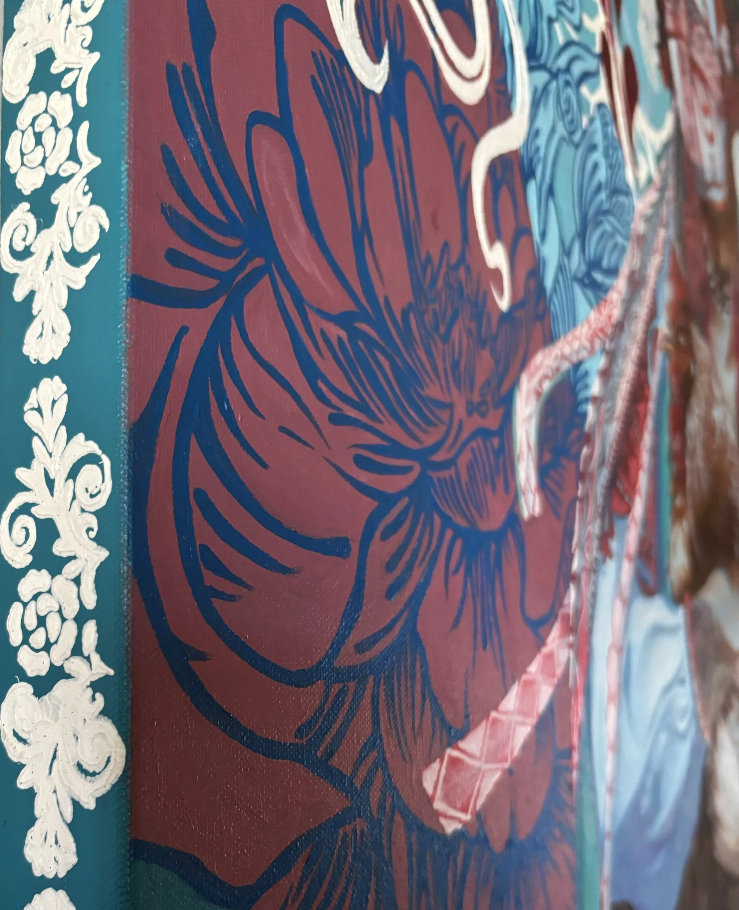 Traditional folk costume, identity partly concealed by a mysterious mask. Holding a chicken before a light blue circle, she stands at the intersection of tradition and transformation. The intricate headdress adorning her head speaks of ancestral heritage, while the snake winding nearby hints at the cycles of life and the unseen forces of change. Amidst a backdrop of upside-down tears and blossoming flowers, the scene resonates with a poignant duality, where sorrow meets resilience and beauty thrives amidst adversity. Through layers of symbolism, the painting invites contemplation on the complexities of identity, the preservation of cultural roots, and the eternal dance between tradition and innovation.